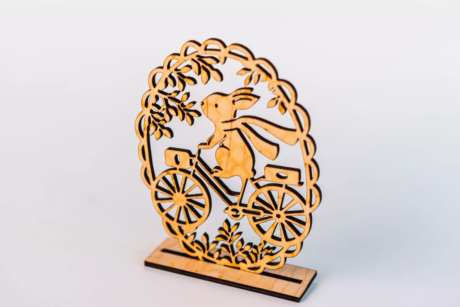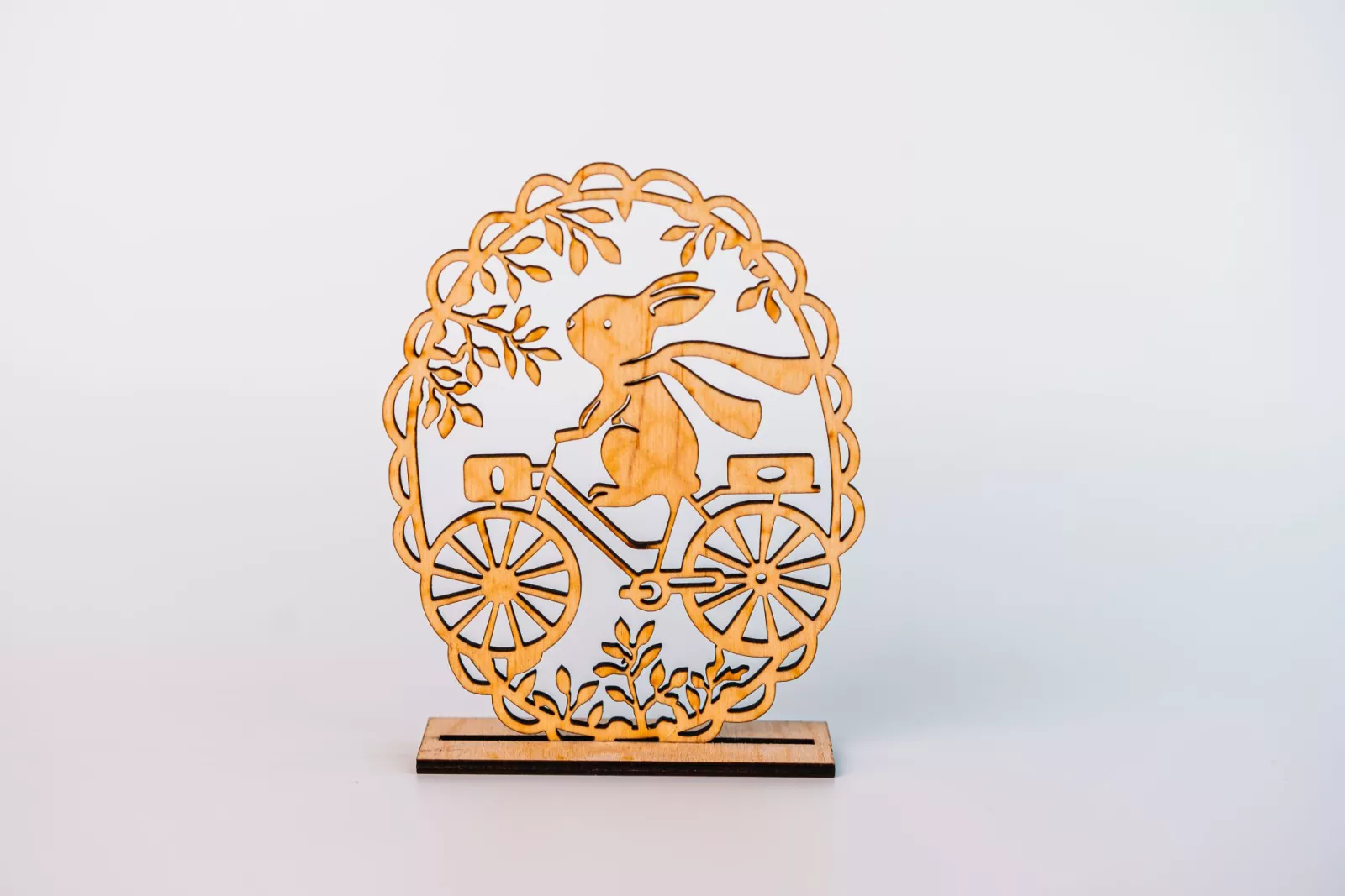 Dřevěný velikonoční zajíček na kole je vyroben z bukové překližky o síle 4 mm. Produkt je určen k dekorativním účelům, může být ozdobou u velikonočních košíčků nebo jen doplňkem Vaší výzdoby.
