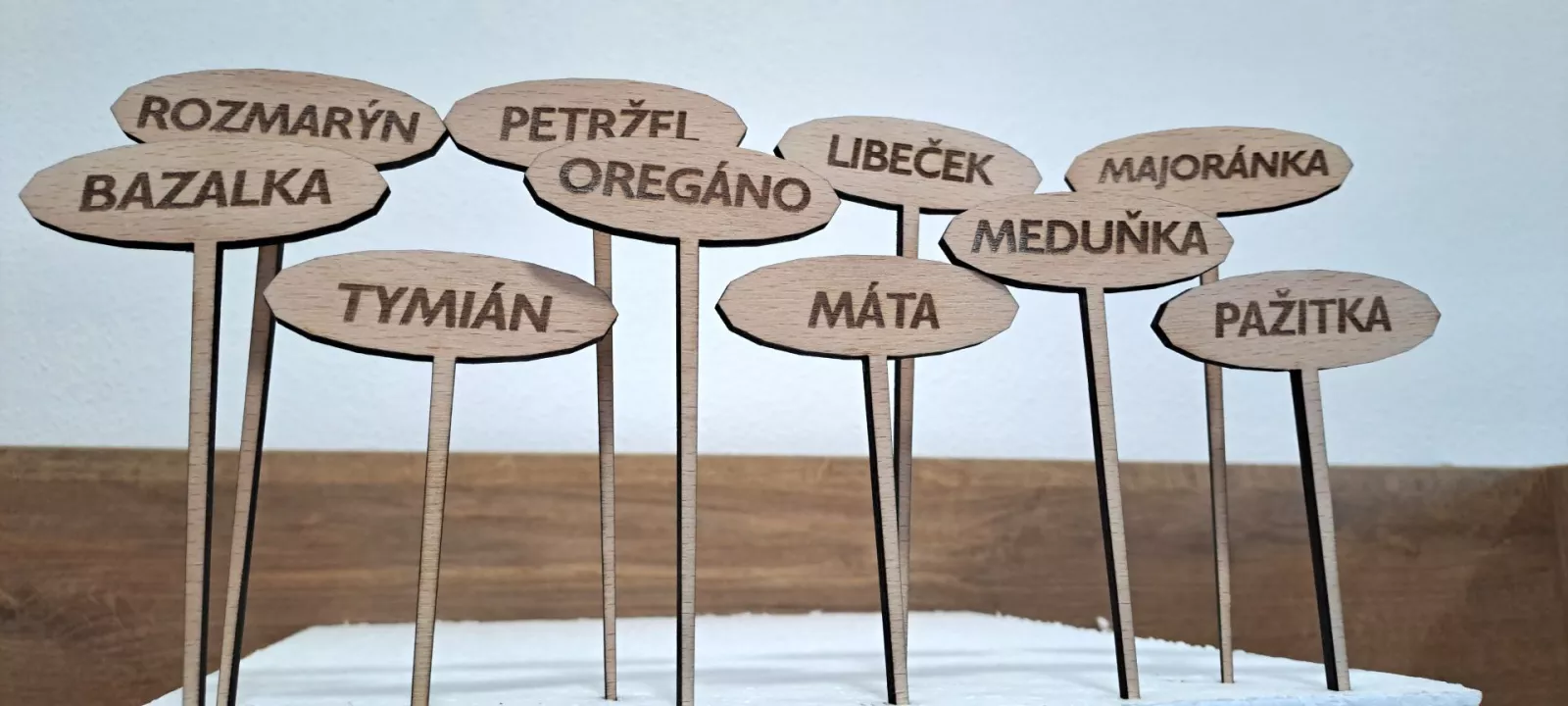 Jedná se o zapichovací cedulky pro bylinky, které jsou vyrobeny z překližky o síle 4 mm. Sada obsahuje 10 kusů cedulek, na nichž jsou vygravírovány názvy bylinek.